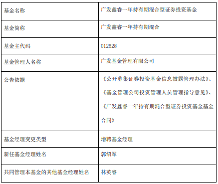 中国经济网北京10月21日电 今日,广发基金公告称,广发信瑞聘请郭少军,持有期一年。郭少军于2018年3月1日加入广发基金管理有限公司,历任信息技术部数据中心岗位、价值投资部量化研究员、稳健策略部量化研究员等职务。广发元。