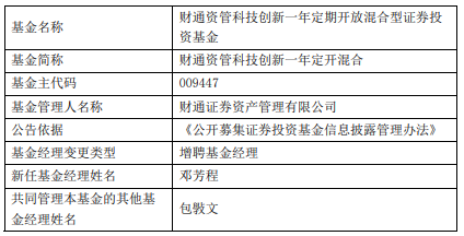 中国经济网北京10月21日电今日,财通证券资产管理有限公司发布公告称,财通资管科技创新将在一年内聘任邓方成先生为混合聘用人员。邓方成先生曾就职于长江证券股份有限公司、华庄证券股份有限公司,2020年1月加入财通证券资产管理有限公司。历任股票研究部研究员,现任职大众股票投资部基金经理。财通资管科技创新1年期固定/开放混合成立于2020年7月10日,截至2025年10月20日,本年收益率为37.74%,成立以来收益率为63.47%,累计净额为1.6102元。